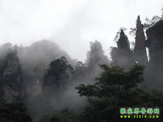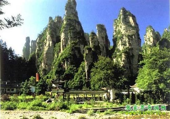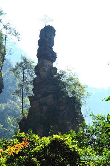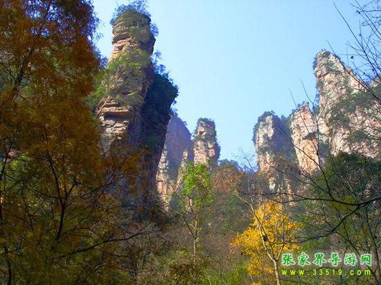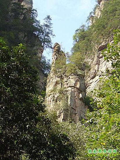 山谷中并排而立的三支山峰,有模有樣,有人叫他們“師徒取經(jīng)”,說那是唐僧、孫悟空、沙和尚三人的“合影”??催^《西游記》的朋友,可能對這片風(fēng)景有似曾相識的感覺,這兒曾是中央電視臺拍攝《西游記》的外景地。有些客人經(jīng)常問,重要人物豬八戒先生怎么沒有趕上這個“合影”呢?他忙里偷閑,在后面背媳婦去了(我們剛才不是看過“豬八戒背媳婦”那個景點嗎?)不小心誤了時辰。如此看來,愛情和事業(yè)有時難免會有點矛盾。