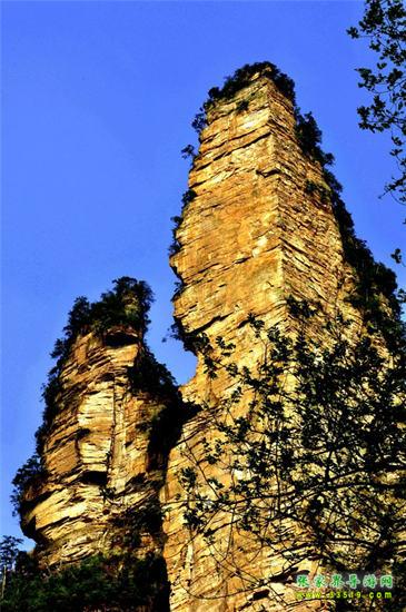 有緣千里來相會,萬水千山總是情。“曾經(jīng)滄海難為水,除卻巫山不是云。”前方這支高300多米的石峰,是不是很像一對情侶?男的身材高大,頭戴頭盔,身披鎧甲,右手摟著女人的腰,左手撫著女人的肩膀。女的身材豐滿,面容清秀,兩眼深情地凝望著自己的愛人。兩人含情脈脈、情意綿綿的樣子好像有千言萬語三天三夜也說不完。您猜猜看,他們是在互相傾訴離別的痛苦呢,還是在相互表達(dá)重逢的喜悅?有詩人這樣寫道:“半是愛憐半是悲,少從軍伍老方回。糟糠啜泣將軍淚,化作春風(fēng)滿谷吹。”相傳這男的是明代抗倭?xí)r一位土家族將軍,一打完仗就千里迢迢,風(fēng)塵仆仆地趕回來和愛人相會。他連頭盔和鎧甲都沒來得及換!這女的自從和心愛的情人離別后,朝思暮想,茶飯不思,“衣帶漸寬終不悔,為伊消得人憔悴”。她清秀的臉上仍顯得有幾分憔悴,卻格外楚楚動人!此情此景,您看到了嗎?您看到的是石頭,還是愛情?山風(fēng)吹在石壁上的聲音和著金鞭溪的流水聲,好像一聲聲祝福:祝您愛情美滿!愿天下有情人終成眷屬!