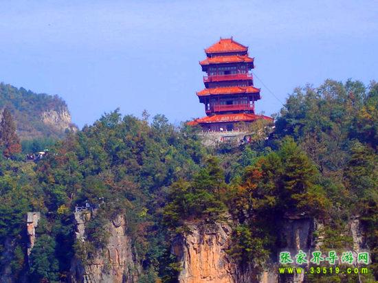 這是六層四重檐穿頭式仿古建筑,高30米,由深圳市政府捐建。建立之初,本打算取名叫“深圳閣”,但遭到許多人(包括深圳人)反對,認(rèn)為這樣與整個天子山的風(fēng)景不是很協(xié)調(diào)。不過從另一個角度來看,深圳人這種“經(jīng)營城市”的意識,卻非常值得張家界人學(xué)習(xí)。“欲窮千里目,更上一層樓”,登樓遠(yuǎn)望,天子山群峰盡收眼底,別有一番風(fēng)景。