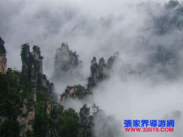 天子山還有云霧、月夜、霞日、冬雪四大奇觀。云霧,是天子山最多見的天象奇觀。有云霧、云海、云濤、云瀑和云彩等景象。久雨初晴之后或霏霏 細(xì)雨之中,先是朦朧大霧,繼而形成白云,環(huán)繞飄浮。群峰在無邊無際的云海中時隱時現(xiàn),使人仿佛置身于蓬萊仙境之中。有時云霧從溪口涌出,爬過峰頂, 然后以鋪天蓋地之勢,飛瀉而下,形成云瀑,十分壯觀。月夜,當(dāng)月明星稀,萬籟俱寂時,這里的峰林被朦朧月色披上了一層“魔紗”,似一群群魔影聳立在幽谷之中。耳聞禽獸嚦嚦的叫聲,使人產(chǎn)生一種神秘感。霞日,晴天的早晨,一輪紅日在朵朵紅云的襯托下,從奇山異峰中冉冉升起。千萬座石塔,婷婷玉立,披上一層紅霞,十分迷人。 冬雪,入冬,天子山銀裝素裹,青松和峰頂被大雪復(fù)蓋。此時的天子山冰柱倒立,冰花四散,只有一些山鹿 、野豬,才不為銀白世界所征服。