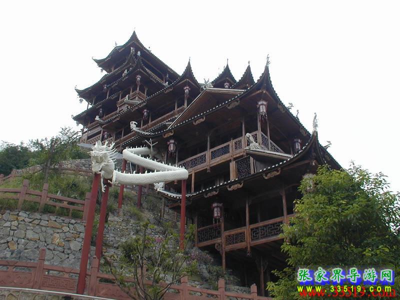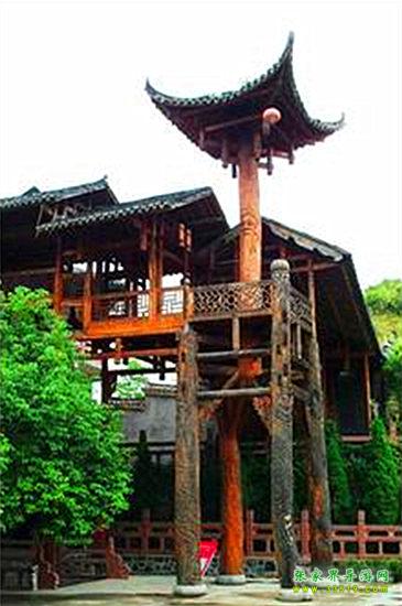 這棟樓高48米,9重12層,分三層天、三層地、三層水,所以叫九重天。全樓依山而建,為純木結(jié)構(gòu),沒(méi)有用一顆鐵釘,是目前世界上最高的一棟吊腳樓。有人這樣寫(xiě)道:“層層樓閣層層天,樓中游人賽神仙,君惹欲知迷宮樂(lè),興步漫攀九重天。”