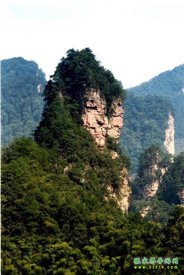 杉樹(shù)林中有一支山峰,很像一位羅漢,光光的頭、圓圓的臉、鼓鼓的肚皮,眉開(kāi)眼笑,好一副“開(kāi)口便笑,笑天下可笑之人;大肚能容,容天下難容之事”的樣子。尤其是他口中還念念有詞,好像在說(shuō):“歡迎您來(lái)張家界!”