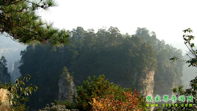 立黃石寨頂東北沿隔澗而望,對面一巖體臺地,高200余米,頂部面積約數(shù)百畝,四圍陡峭如削。其上長滿黑黝黝的樹木,借助望遠(yuǎn)鏡,可看清有武陵松等,蒼翠蓊郁,猶如綠色迷宮。