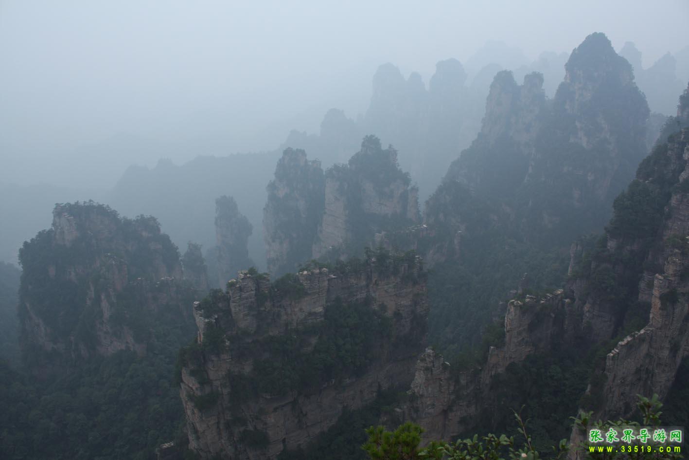 自乾坤柱觀景臺(tái)向西轉(zhuǎn)過一彎,有頂端平整的巖嘴突出崖沿6米左右,臨絕壁半面有四個(gè)邊長(zhǎng)相等的天然鈍角,銀灰色銅管欄桿圍護(hù),左右石凳排列,別致而高雅。憑欄極目,遠(yuǎn)處六巨峰兩兩相對(duì),排列成陣,頂天立地,氣勢(shì)磅礴。另有兩峰如屏,橫斷天際。兩峰屏、六峰柱之間的谷中,四座瘦長(zhǎng)石峰次第而下,自遠(yuǎn)而近,由高到低,連成一線,長(zhǎng)達(dá)兩千多米,有如梯級(jí)。在這四座瘦長(zhǎng)石峰中上部,另有兩巨峰偎依,渾圓如柱。據(jù)說是如來佛伸出的兩根指頭,其用意如何,至今無人能解。其下有巨石構(gòu)成的天然神殿,如雨后晴明,殿內(nèi)佛像依稀可見。右側(cè)一峰頂部似靴,據(jù)說是登“步步高”上天梯的神人走得匆忙,遺忘一只在此。攀欄俯視,300多米深的絕壁根前,有兩排峰體如古城門,八字排列,墻壁斑駁陸離,古野凄涼。古城門與步步高天梯相聯(lián)成趣:昔人拾級(jí)登天去,此地空余古城門。“昔人”是誰?“古城門”建于哪朝哪代?留與后秀破解。這里雖有諸多疑團(tuán)使人困惑,但是充滿幽野之美,引人入勝。