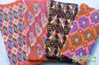 織錦。又名“西蘭卡普”、“土花鋪蓋”,為土家族傳統(tǒng)工藝品之一,是森林公園工藝品廠的主要產(chǎn)品??楀\是在特制的本質(zhì)織機上以錦紗為經(jīng)、五彩絲線為緯、手工提花織成。以其質(zhì)地厚實、堅韌,色彩鮮艷,格調(diào)古樸,流暢生動著稱。圖案有花草、鳥獸、生產(chǎn)、生活、幾何、字樣等種類。為舊時土家姑娘必備嫁妝之一。據(jù)考證,早在漢代,土家織錦就作為方物貢入漢室宮廷。20世紀(jì)后,土家織錦曾漂洋過海至日、美、英等國展出,并作為禮品,被國家領(lǐng)導(dǎo)人贈送給外國元首及政府官員,如今織錦以壁掛、枕巾、沙發(fā)墊、桌圍、提袋、服飾等多種式樣遠(yuǎn)銷世界各地。