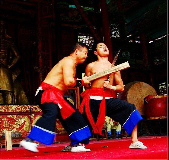大庸氣,堪稱武林奇葩,曾為祖國(guó)贏得聲譽(yù),海內(nèi)外享有極主名望。 大庸氣功是大庸各民族特別是土家族傳統(tǒng)體育項(xiàng) 目之了,分健體氣派、武術(shù)氣功兩類。前者有“返還 功”、“馬王推氣功”、“少林達(dá)摩醫(yī)療保健氣功” 等;后者有靜坐、壁虎、靈子、二指彈、碎石、松靜 、硬氣、五禽、五陽(yáng)功等,尤以硬氣功著稱。大庸硬 氣功,歷史悠久,漢代相單程,明代覃后,清代劉明 燈,當(dāng)代湯子模、周鐵鞭、杜心武、趙繼書等都具有 超人硬氣武功。大庸土著民族在漫長(zhǎng)的反征服、反壓 迫斗爭(zhēng),博采武當(dāng)、少林南北派、昆侖派眾家武林精 華,創(chuàng)造出獨(dú)此一家的大庸硬氣功。 據(jù)傳,大庸硬氣功鼻祖是楚國(guó)鬼谷子?!队蓝h 志》有關(guān)鬼谷子隱居天門山鬼谷洞潛心學(xué)《易》、傳 授方術(shù)的記載。到清代有武林高手朱茂嶺,隱居三岔 村北芭蕉灣洞,研究鬼谷氣功之術(shù),后收西溪坪胡口 子、余世萬(wàn)(即“余通人”)為徙,傳其衣缽。余通 人將武術(shù)氣功系統(tǒng)整理,發(fā)揚(yáng)光大,播名于世。 新中國(guó)成立后,黨和政府十分重視民間氣功發(fā)掘 整理,并正式列為體育項(xiàng)目加以普及發(fā)展,今日大庸 市習(xí)練硬氣功達(dá)數(shù)萬(wàn)人眾。永定區(qū)官黎坪村世有“硬 氣功之鄉(xiāng)”盛譽(yù),該村男女老幼,練功已蔚成風(fēng)氣, 其武師趙繼書,1979年先后參加全省和全國(guó)武術(shù)大賽 ,均獲一等獎(jiǎng),受到國(guó)家體委重視,同年7 月趙繼書 專程到北京給中央領(lǐng)導(dǎo)同志匯報(bào)表演。嗣后,隨同中 國(guó)武術(shù)代表團(tuán)和國(guó)家領(lǐng)導(dǎo)人先后兩次出國(guó),到盧森堡 、意大利、比利時(shí)、羅馬尼亞、馬其他和東南亞等國(guó) 家訪問(wèn)。他表演的臥刀碎石、頭頂開石、雙鳳灌耳、 頭碰石柱、叉尖推磨等精彩節(jié)目,博得外國(guó)友人好評(píng) 。盧森堡一位榮獲國(guó)家獎(jiǎng)牌的武士,看了表演后連夜 來(lái)到中國(guó)大使館,將自己珍藏多年的獎(jiǎng)牌贈(zèng)送給他; 盧森堡國(guó)王主動(dòng)熱情走上臺(tái)與趙繼書熱情擁抱,連連 稱贊:“了不起!了不起!國(guó)際氣功大師!”并把珍 藏紀(jì)念章一枚贈(zèng)送給趙繼書。一位法國(guó)朋友十分贊賞 說(shuō):“中國(guó)的氣功,稱為全人類的寶貴財(cái)富,是有科 學(xué)道理的。”自此,大庸硬氣功譽(yù)滿全球。湖南瀟湘 電影制片廠專門拍攝了彩色紀(jì)錄片《大庸氣功》。 大庸硬氣功共有二十多個(gè)項(xiàng)目,最有影響的是: 腹臥鋼叉 由二人在地面扶住一根叉尖朝上的三 股鋼叉,叉尖猁鋒利,然后一個(gè)俯身叉尖,尖抵腹部 ,待其四肢平展懸空,扶叉二人轉(zhuǎn)動(dòng)鋼叉,謂之推磨 。表演時(shí),要求臥叉者運(yùn)氣于腹,氣意集中,稍有大 意,叉即穿腹而過(guò)。 臥刀破石 先固定兩把大刀,刀口朝上,臥刀者 運(yùn)氣后,由其他人抬臥于刀口上(有仰臥、俯臥兩種) ,然后在臥刀者腹部或背部置一碩大石條(約數(shù)百斤) ,一人或兩人輪大鐵錘狠擊石條直至斷裂破碎為止。 釘?shù)洞财剖?地上倒一層碎玻璃片,一人仰臥其 上;然后腹上置釘床,又一人仰臥釘床上,再于第二 人腹上置釘床,第三人仰臥刀床上,腹部上壓一塊數(shù) 百斤大條石,由人掄錘狠砸,至石破為止。 銀槍刺喉 用一根兩頭安有鋒利槍頭的鋼槍,抵 置兩位表演者喉部,然后相對(duì)發(fā)力,至槍桿抵成彎弓 形而喉部安然無(wú)恙。 徙手?jǐn)嗍?表演者將堅(jiān)滑如鐵一塊卵石置于石凳 (地)上,然后運(yùn)氣于掌或指擊斷(碎)卵石。 踢腿斬石 表演者運(yùn)氣于腿,以腿踢斷石條。一 般可踢斷15公分以上厚度的麻石條或青石條。 胸部打刀 將鋒利大刀刃口置于胸部肌肉上,用 一根拳頭粗木棒猛擊刀背,至棒斷而胸部無(wú)傷。 新中國(guó)成立以來(lái),大庸民間武術(shù)與民族體育逐漸 融為一體,發(fā)揮著提高人民身體素質(zhì)、弘揚(yáng)中華武術(shù) 傳統(tǒng)和增進(jìn)國(guó)際友誼重大作用。除硬氣功外,還有數(shù) 十種武術(shù)形式散見于民間武術(shù)體育活動(dòng)之中。如打飛 棒、扭扁擔(dān)、抵搭斗杠、擠油渣、甩抱腰、舉石鎖、 板牛角(一種斗牛形式)等等。其特點(diǎn)是因地制宜, 不分場(chǎng)地,凡田園地角院壩集鎮(zhèn),都是習(xí)武練功、開 展活動(dòng)的處所,頗具泥土氣息。擬或以生活中某些動(dòng) 作和動(dòng)物的某種形態(tài),稍加模仿演繹,便成某一獨(dú)特 武術(shù)形式。如天門武術(shù)功夫大師余道人所創(chuàng)造的“宮 天梳”、“巖燕樸天門”等;也有就地理特點(diǎn)創(chuàng)造某 種武功形式的,如“蕩藤”等。