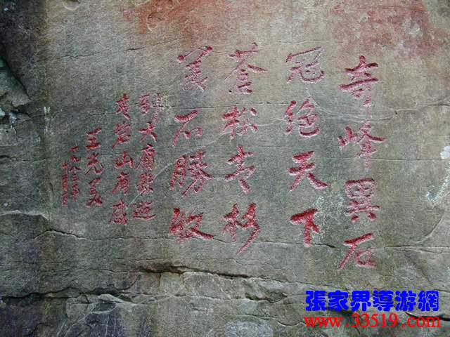 (王光美詩刻)1983年11月30日,前國家主席劉少奇夫人王光美在省人大副主任羅秋月等人陪同下,登上了張家界,她是最早訪問張家界的上層名流。想當年,這里還是一條人工剛剛挖出來的小毛路,王光美被一路風光所震撼,也不免勾起了許多關于劉少奇的往事。這四句詩并不是一氣呵成的,前后到了四處景點,才吟出這四句詩來:奇峰異石,冠絕天下,蒼松青杉,美不勝收。