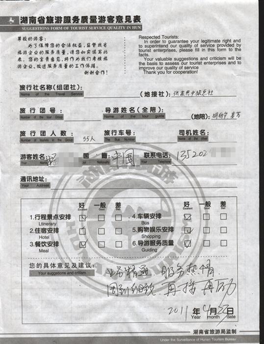 2011年4月23日楊先生一行55人旅游質(zhì)量反饋:業(yè)務(wù)精通,服務(wù)熱情,周到細致,再接再厲!