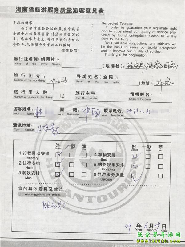 6月25日山東韓先生一行4人接待質量反饋單: