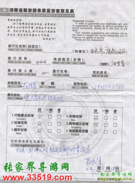 2009年6月25日安徽楊先生一行18人接待質量反饋表: