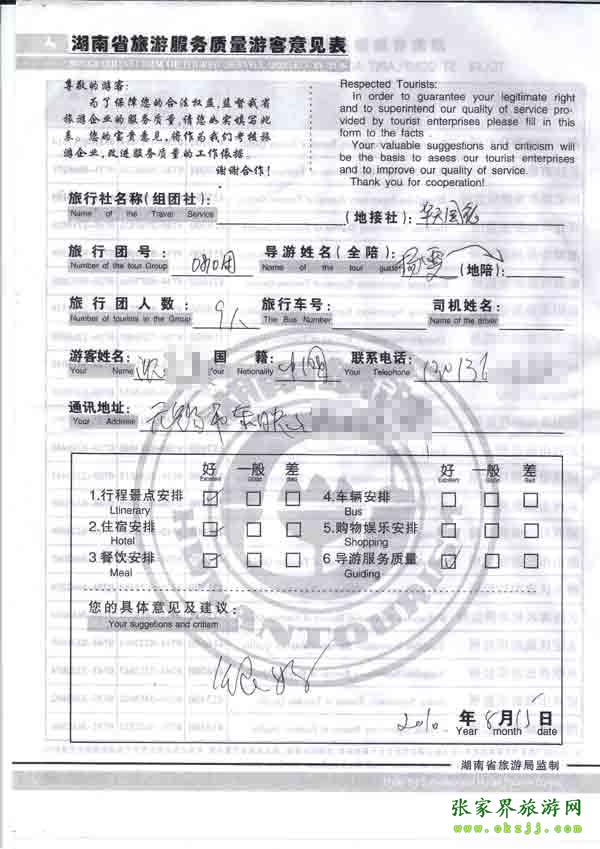 2010年8月15日無錫沈小姐一行9位旅游質(zhì)量反饋:很好